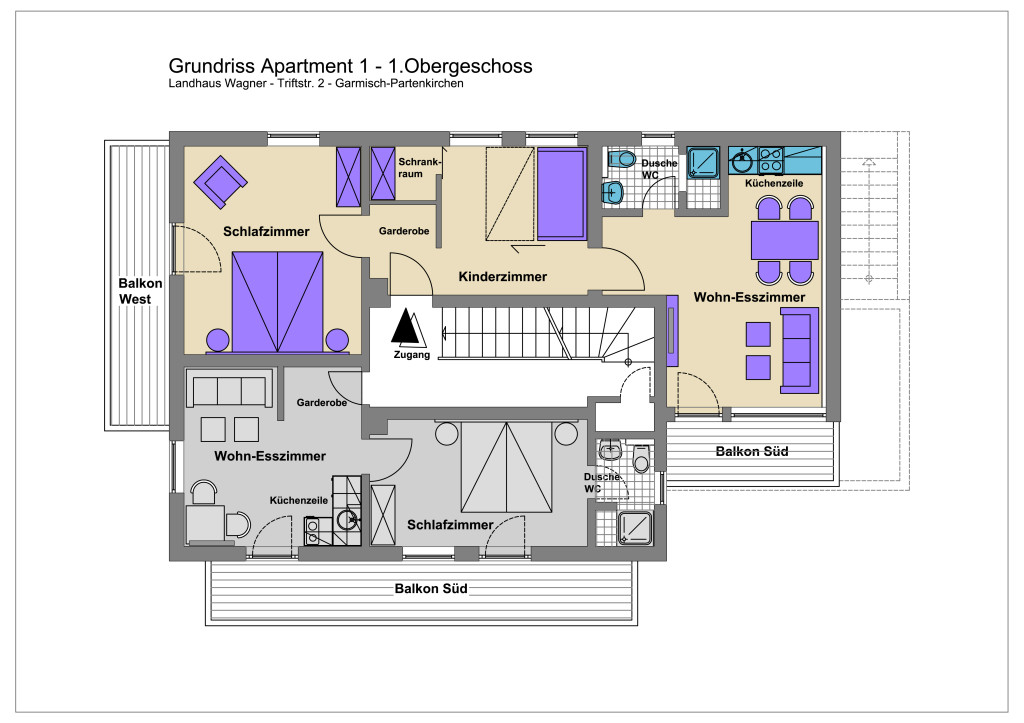 Die moderne Ferienwohnung in Garmisch-Partenkirchen bietet ihnen genügend Platz für bis zu 4 Personen. Ein Schlafzimmer mit Doppelbett und einen Lesesessel und Leselampe und Zugang zum Südwest-Balkon mit herrlichem Blick auf das Kramermassiv und den Waxenstein und die Alpspitze. In der kleinen Garderobe am Eingang der Ferienwohnung, können sie ihre Straßenkleidung ablegen. Das 2. Schlafzimmer (Kinderzimmer) ist mit zwei Betten (davon ein Ausziehbett 200 cm x 90 cm) und einem begehbaren Kleiderschrank ausgestattet. Im Badezimmer befindet sich eine geräumige Dusche, ein WC und ein Waschbecken, sowie ein Kosmetikspiegel und ein Föhn. Die Küchenzeile, im großen Wohn- / Essbereich, ist mit einer Spülmaschine, Cerankochfeld, Mikrowelle, Kühlschrank, Wasserkocher, Toaster und Kaffeemaschine und allen notwendigen Utensilien die man zum Kochen benötigt ausgestattet. Im Wohnbereich der Ferienwohnung, können Sie es sich auf dem Sofa, mit einer kuscheligen Decke gemütlich machen, Fernsehen oder einen Film genießen. Der Südbalkon des Wohnzimmers eignet sich hervorragend zum Frühstücken und einen Blick auf das Wettersteingebirge zu werfen. Selbstverständlich ist auch ein kostenloser WLAN Zugang vorhanden.