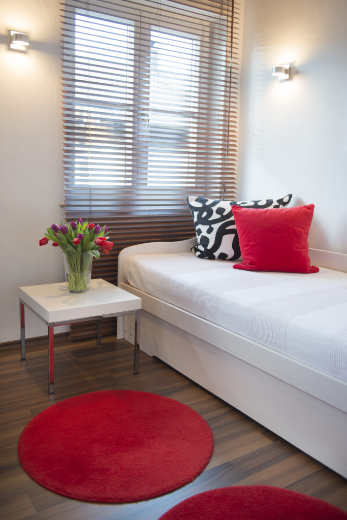 Schlafzimmer mit Doppelbett und Leseecke mit Sessel und Kleiderschrank, Zugang zum Balkon.